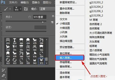 3、然后,从画笔的设置菜单中选择“载入画笔”,选择第1步解压的目录。