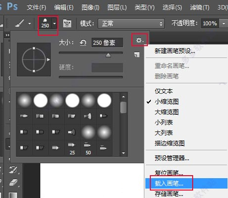 3、在这个下拉框的右上角,有一个小箭头,点击它,并在出来的菜单中选择“载入画笔”;