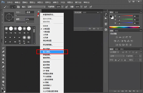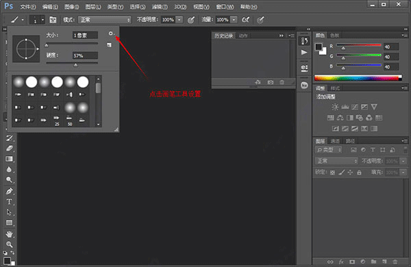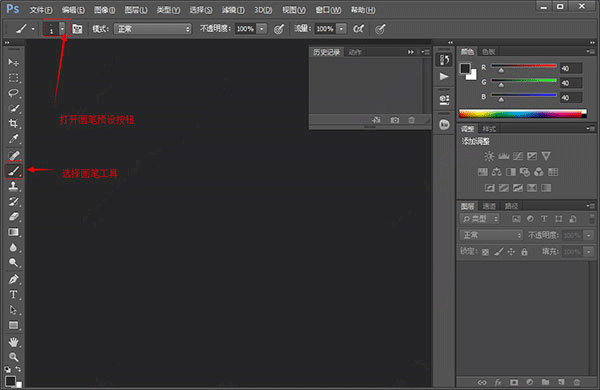 1、在PS界面中选择画笔工具,点击画笔预设按钮。