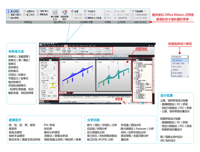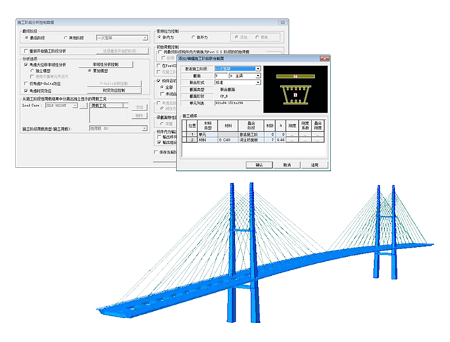 5、提供静力分析(线形静力分析、热应力分析)、动力分析(自由振动分析、反应谱分析、时程分析)、静力弹塑性分析、动力弹塑性分析、动力边界非线形分析、几何非线形分析(P-delta分析、大位移分析)、优化索力、屈曲分析、移动荷载分析(影响线/影响面分析)、支座沉降分析、热传导分析(热传导、热对流、热辐射)、水化热分析(温度应力、管冷)、施工阶段分析、联合截面施工阶段分析等功能。