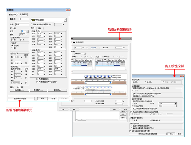 新增7自由度梁单元 -> 轨道分析建模助手 -> 施工线形控制。