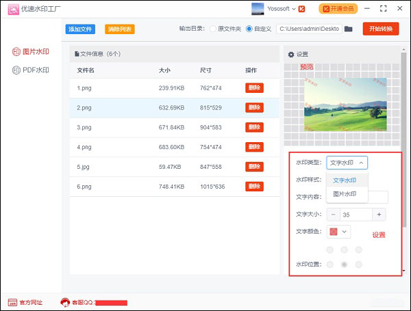 4、文字水印样式丰富,自定义字体大小/位置/颜色和透明度;