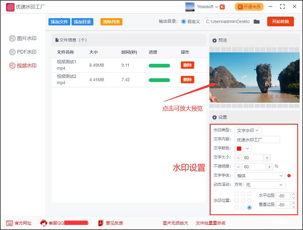 步骤2,导入完视频就是设置环节了,如下图所示软件右下方,水印类型选择“文字水印”,在下方输入文字内容;然后设置文字水印的颜色/大小/透明度/自提/位置等参数,还可以设置文字水印成动态的。在上面可以预览水印的样式,点击可以放大预览。