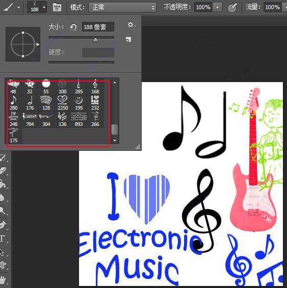 4、找到最后的画笔就是ps音乐符号笔刷,有多种类别,用户可以调整大小直接放在图片上使用。