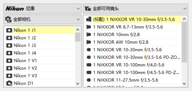 值得注意的是,必须选择同时了机身型号及其对应的镜头后程序才允许下一步操作。当前所选的器材会以黄色高亮显示。