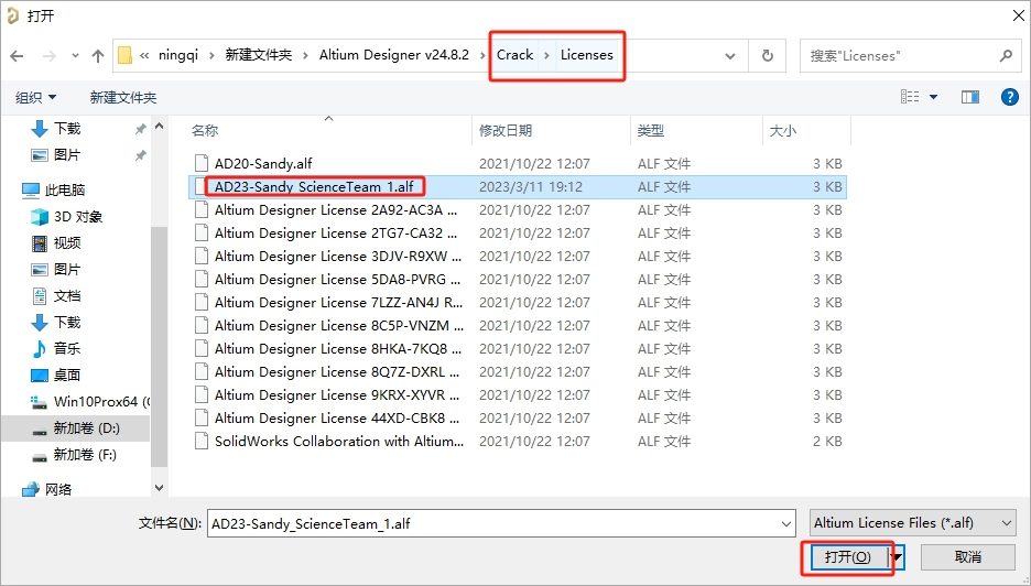 9、找到软件安装包Licenses里面的AD23-Sandy_ScienceTeam_1.alf打开;