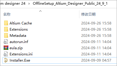 2、首先将文件“OfflineSetup_Altium_Designer_Public_24_9_1.zip”解压出来,双击文件“Installer.Exe”安装软件;