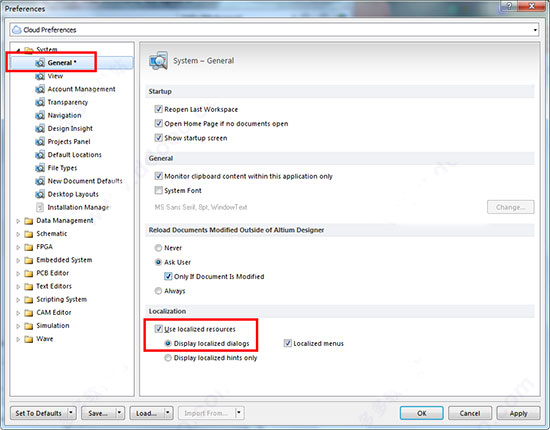 7、安装完成后,运行Altium Designer 13,软件默认英文,我们点击DXP,选择Preferences,点击“system”》“general”》勾选“use localized resources”,然后重启软件就可以体验简体中文界面