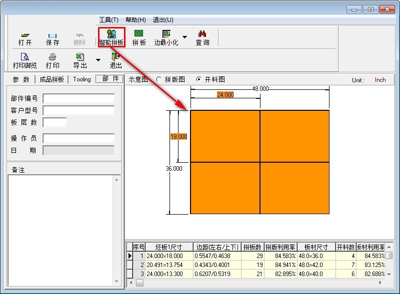 软件的主要功能包括智能拼版、快速查询部件信息、自动生成Tooling等。它还支持Excel报表输出和打印,开料算法精准,能够找到最佳开料方案,并提供多种开料选择以满足不同需求。此外,用户可以手动调整开料尺寸,灵活性很高。