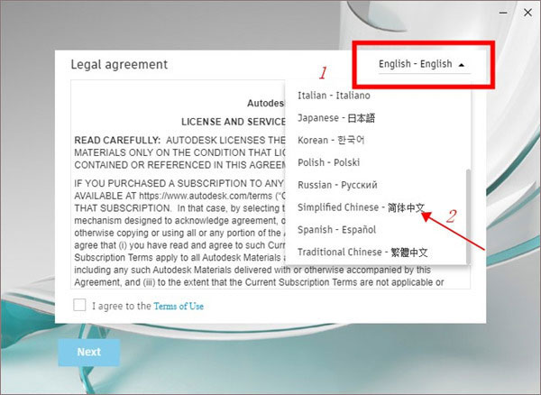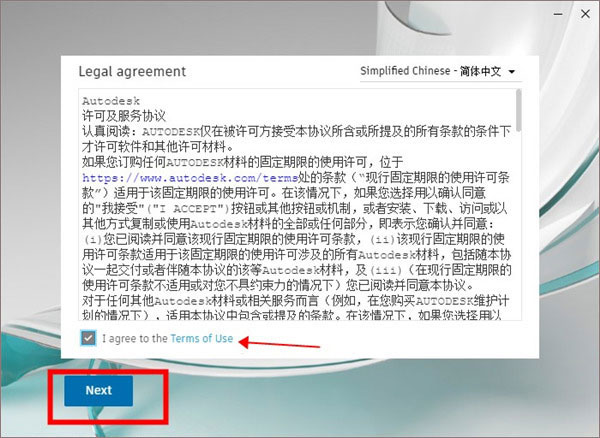 4、然后就变成中文,勾选I agree to the Terms of Use同意使用条款,然后点击Next下一步;