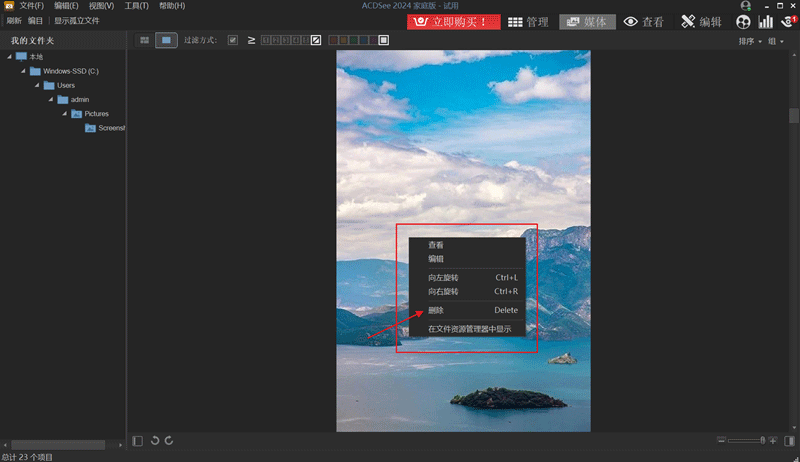 1、管理模式是用户界面中主要的浏览和管理组件,也是使用桌面上的快捷方式图标启动 ACDSee 2022 家庭版 时会看到的模式。在管理模式下,可以查找、移动、预览、排序文件,还可以访问整理和共享工具。