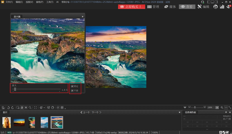 3、更改“放大镜”窗格的设置:移动窗格底部的滑块,增加或缩小缩放比例;勾选固定复选框,将滑块设置应用于原始大小的图像,取消勾选固定复选框,将滑块设置应用于“查看”模式中缩放过的图像的缩放比例;勾选平滑复选框,可以对图像的放大部分应用图形保真,或者取消勾选平滑复选框,可以查看单个像素。图形保真可以减少锯齿状线,也称为“锯齿”。
