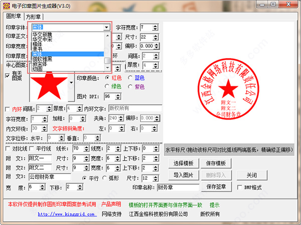 电子印章图片生成器3.0是一款专业的电子印章图片制作软件,为用户提供了多种电子印章图片模板,可以帮助用户快速生成多种样式、多种规格的电子印章。该软件能够支持公章、财务专用章、发票章、合同专用章、转账转讫章、现金清讫章、各种私章以及私章阴章模板等多种印章,每一种印章模板都可以根据你的需求来设置版式,你可以任意改动画笔宽度、线框宽度、线宽高度、切角长度以及线框的左右平移。另外,用户还可以选择印章规格以及印章颜色,更换前景色以及背景色,选择你要的分辨率,还可以自定义内刊图,帮助用户省去了不少麻烦,提高工作效率,是一款非常实用的电子印章图片生成工具。