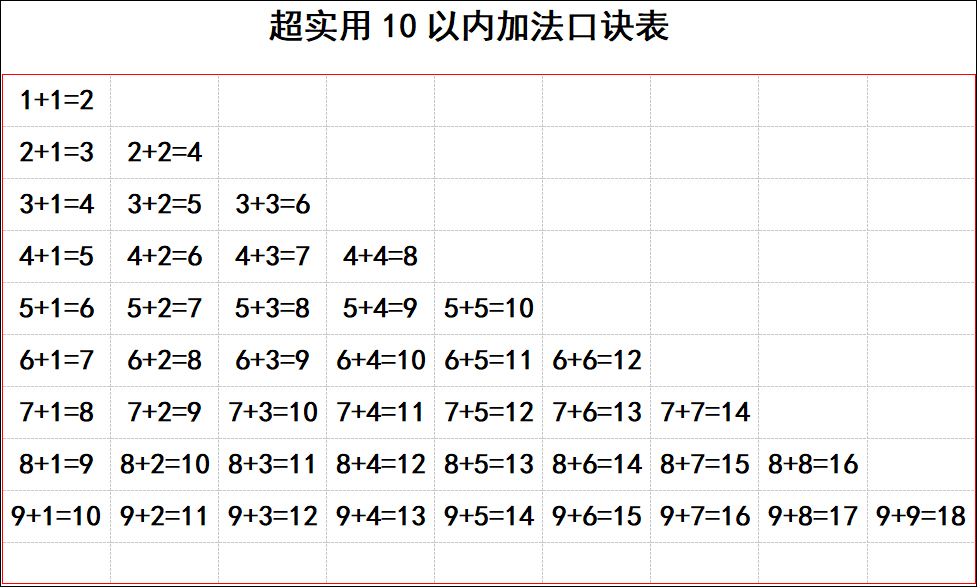 想让你的孩子口算能力更好吗?那么可以配合20以内加法口诀表打印版来学习,这是专门为小学生而提供的一个二十以内的口诀表,其中主要提供了Word表格版和Excel版两种,并这两种版本中全部都是高清大图无水印的,可随意免费打印的,接着打印后即可给孩子好好的学习二十以内的加法减法口诀。