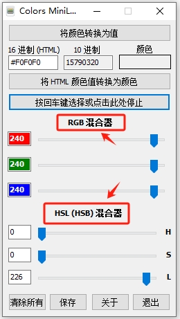 HSL 混合器:拖动 HSL 滑块可设置查看颜色结果,以及十六进制、十进制和 RGB 值