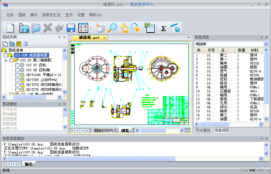 用户可以自己定义各种不同目的的汇总表要求,包括汇总表的名称,内容构成,需要汇总信息字段,汇总计算表达式等,形成固定的配置,系统根据这些配置,从图纸中自动提取关键信息,形成如“图纸清单”,“零件清单”,“材料清单”等汇总表,该功能大大降低了设计人员制作这些汇总表的工作量,同时由于省去了重新抄录的过程,降低了失误的可能性。