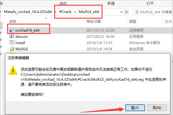7、打开Crack文件夹,运行cncKad16_x64.reg导入注册表;