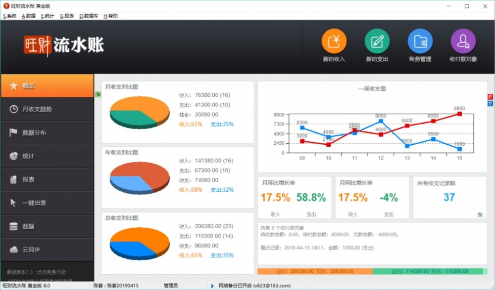 11、统计功能,分类统计、来源统计、收付款对象年、月、历年统计、月收支统计、年收支统计、指定年、月统计、历年收支统计、分类收支统计、经办人收支统计、自定义统计等等……
