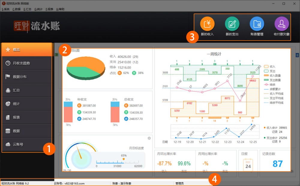 旺财流水账主界面主要分四个区域,如图:
