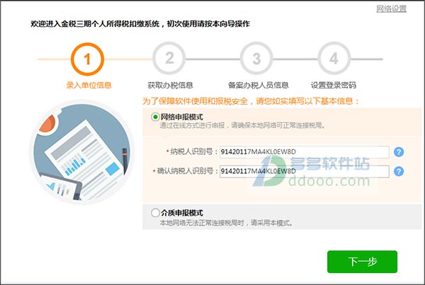 1、下载软件后,正确安装天津金税三期个人所得税扣缴系统;2、打开软件,首先录入单位信息,支持网络申报和介质申报两种模式;