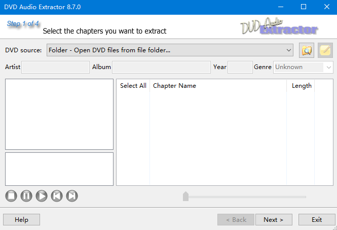 新添加的音频播放/预览功能允许你听选中的章节,这样你可以确定这些章节真的是你想提取的,您还可以使用DVD Audio Extractor作为一个独立的DVD中光盘音频播放器使用