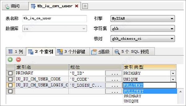 第二步,在打开的界面,修改表结构和索引等信息。比如,修改把索引属性修改为FULLTEXT的