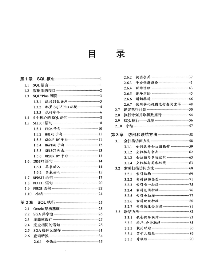 第1章 SQL核心 1.1 SQL语言 1.2 数据库的接口 1.3 SQL*Plus回顾 1.3.1 连接到数据库 1.3.2 配置SQL*Plus环境 1.3.3 执行命令 1.4 5个核心的SQL语句 1.5 SELECT语句 1.5.1 FROM子句 1.5.2 WHERE子句 1.5.3 GROUP BY子句 1.5.4 HAVING子句 1.5.5 SELECT列表 1.5.6 ORDER BY子句 1.6 INSERT语句 1.6.1 单表插入 1.6.2 多表插入 1.7 UPDATE语句 1.8 DELETE语句 1.9 MERGE语句 1.10 小结 第2章 SQL执行 2.1 Oracle架构基础 2.2 SGA共享池 2.3 库高速缓存 2.4 完全相同的语句 2.5 SGA缓冲区缓存 2.6 查询转换 2.6.1 查询块 2.6.2 视图合并 2.6.3 子查询解嵌套 2.6.4 联结消除 2.6.5 排序消除 2.6.6 谓词推进 2.6.7 使用物化视图进行查询重写 2.7 确定执行计划 2.8 执行计划并取得数据行 2.9 SQL执行--总览 2.10 小结 第3章 访问和联结方法 3.1 全扫描访问方法 3.1.1 如何选择全扫描操作 3.1.2 全扫描与舍弃 3.1.3 全扫描与多块读取 3.1.4 全扫描与高水位线 3.2 索引扫描访问方法 3.2.1 索引结构 3.2.2 索引扫描类型 3.2.3 索引唯一扫描 3.2.4 索引范围扫描 3.2.5 索引全扫描 3.2.6 索引跳跃扫描 3.2.7 索引快速全扫描 3.3 联结方法 3.3.1 嵌套循环联结 3.3.2 排序-合并联结 3.3.3 散列联结 3.3.4 笛卡儿联结 3.3.5 外联结 3.4 小结 第4章 SQL是关于集合的 4.1 以面向集合的思维方式来思考 4.1.1 从面向过程转变为基于集合的思维方式 4.1.2 面向过程与基于集合的思维方式:例子 4.2 集合运算 4.2.1 UNION和UNION ALL 4.2.2 MINUS 4.2.3 INTERSECT 4.3 集合与空值 4.3.1 空值与非直观结果 4.3.2 空值与集合运算 4.3.3 空值与GROUP BY和ORDER BY 4.3.4 空值与聚合函数 4.4 小结 第5章 提出问题 5.1 问出好的问题 5.2 提问的目的 5.3 问题的种类 5.4 问题的问题 5.5 数据的问题 5.6 建立逻辑表达式 5.7 小结 第6章 SQL执行计划 6.1 解释计划 6.1.1 使用解释计划 6.1.2 PLAN_TABLE 6.1.3 分解计划 6.1.4 导致解释计划未达目的的原因 6.1.5 阅读计划 6.1.6 访问和筛选谓语 6.1.7 使计划便于阅读 6.2 执行计划 6.2.1 查看最近生成的SQL语句 6.2.2 查看相关执行计划 6.2.3 收集执行计划统计信息 6.2.4 标识SQL语句以便以后取回计划 6.2.5 深入理解DBMS_XPLAN 6.2.6 使用SQL监控报告 6.2.7 使用计划信息解决问题 6.3 小结 第7章 高级分组 7.1 基本的GROUP BY用法 7.2 HAVING子句 7.3 GROUP BY的"新"功能 7.4 GROUP BY的CUBE扩展 7.5 CUBE的实际应用 7.6 用GROUPING()函数排除空值 7.7 用GROUPING()扩展报告 7.8 用GROUPING_ID()扩展报告 7.9 GROUPING SETS与ROLLUP() 7.10 GROUP BY局限性 7.11 小结 第8章 分析函数 8.1 概览 8.2 示例数据 8.3 分析函数剖析 8.4 函数列表 8.5 聚合函数 8.5.1 跨越整个分区的聚合函数 8.5.2 细粒度窗口声明 8.5.3 默认窗口声明 8.6 lead和lag 8.6.1 语法和排序 8.6.2 例1:从前一行中返回一个值 8.6.3 理解数据行的位移 8.6.4 例2:从下一行中返回一个值 8.7 first_value和last_value 8.7.1 例子:使用first_value计算最大值 8.7.2 例子:使用last_value计算最小值 8.8 其他分析函数 8.8.1 nth_value 8.8.2 rank 8.8.3 dense_rank 8.8.4 row_number 8.8.5 ratio_to_report 8.8.6 percent_rank 8.8.7 percentile_cont 8.8.8 percentile_disc 8.8.9 NTILE 8.8.10 stddev 8.8.11 listagg 8.9 性能调优 8.9.1 执行计划 8.9.2 谓词 8.9.3 索引 8.10 高级话题 8.10.1 动态SQL 8.10.2 嵌套分析函数 8.10.3 并行 8.10.4 PGA大小 8.11 组织行为 8.12 小结 第9章 MODEL子句 9.1 电子表格 9.2 使用MODEL子句实现跨行引用 9.2.1 示例数据 9.2.2 剖析MODEL子句 9.2.3 规则 9.3 位置和符号引用 9.3.1 位置标记 9.3.2 符号标记 9.3.3 FOR循环 9.4 返回更新后的行 9.5 求解顺序 9.5.1 行求解顺序 9.5.2 规则求解顺序 9.6 聚合 9.7 迭代 9.7.1 示例 9.7.2 PRESENTV与空值 9.8 查找表 9.9 空值 9.10 使用MODEL子句进行性能调优 9.10.1 执行计划 9.10.2 谓词推进 9.10.3 物化视图 9.10.4 并行 9.10.5 MODEL子句执行中的分区 9.10.6 索引 9.11 子查询因子化 9.12 小结 第10章 子查询因子化 10.1 标准用法 10.2 用WITH定义PL/SQL函数 10.3 SQL优化 10.3.1 测试执行计划 10.3.2 测试查询改变的影响 10.3.3 寻找其他优化机会 10.3.4 将子查询因子化应用到PL/SQL中 10.4 递归子查询 10.4.1 CONNECT BY示例 10.4.2 RSF示例 10.4.3 RSF的限制条件 10.4.4 与CONNECT BY的不同点 10.5 复制CONNECT BY的功能 10.5.1 LEVEL伪列 10.5.2 SYS_CONNECT_BY_PATH函数 10.5.3 CONNECT_BY_ROOT运算符 10.5.4 CONNECT_BY_ISCYCLE伪列和NOCYCLE参数 10.5.5 CONNECT_BY_ISLEAF伪列 10.6 小结 第11章 半联结和反联结 11.1 半联结 11.2 半联结执行计划 11.3 控制半联结执行计划 11.3.1 使用提示控制半联结执行计划 11.3.2 在实例级控制半联结执行计划 11.4 半联结限制条件 11.5 半联结必要条件 11.6 反联结 11.7 反联结执行计划 11.8 控制反联结执行计划 11.8.1 使用提示控制反联结执行计划 11.8.2 在实例级控制反联结执行计划 11.9 反联结限制条件 11.10 反联结必要条件 11.11 小结 第12章 索引 12.1 理解索引 12.1.1 什么时候使用索引 12.1.2 列的选择 12.1.3 空值问题 12.2 索引结构类型 12.2.1 B-树索引 12.2.2 位图索引 12.2.3 索引组织表 12.3 分区索引 12.3.1 局部索引 12.3.2 全局索引 12.3.3 散列分区与范围分区 12.4 与应用特点相匹配的解决方案 12.4.1 压缩索引 12.4.2 基于函数的索引 12.4.3 反转键索引 12.4.4 降序索引 12.5 管理问题的解决方案 12.5.1 不可见索引 12.5.2 虚拟索引 12.5.3 位图联结索引 12.6 小结 第13章 SELECT以外的内容 13.1 INSERT 13.1.1 直接路径插入 13.1.2 多表插入 13.1.3 条件插入 13.1.4 DML错误日志 13.2 UPDATE 13.2.1 CTAS与UPDATE的差别 13.2.2 INSERT APPEND与UPDATE的差别 13.3 DELETE 13.4 MERGE 13.4.1 语法和用法 
