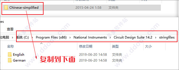 11、如需汉化,可以将multisim14.2中文补丁“Chinese-simplified”复制到软件目录下的stringfiles文件夹,默认目录为【C:\Program Files (x86)\National Instruments\Circuit Design Suite 14.2\stringfiles】