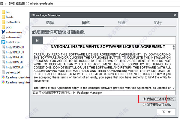 2、用虚拟机加载ni-cds-professional_14.2.0_offline.iso镜像文件,或winrar解压,如win10系统可以右击以windows资源管理器打开,双击“install.exe”开始安装,接受条款;