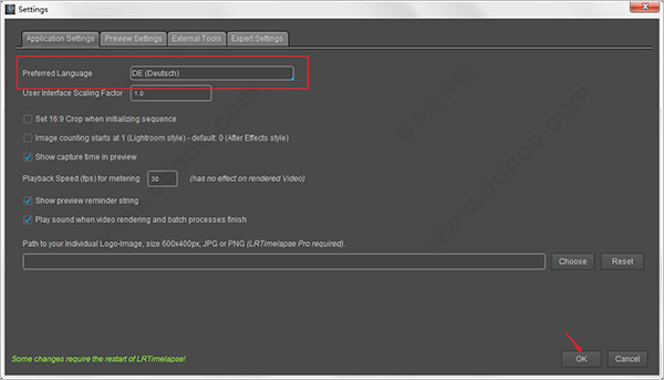 8、在Language语言选择DE(deutsch),点击ok,重新启动该软件;