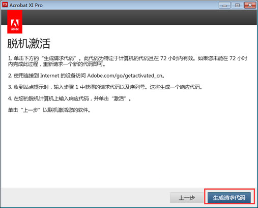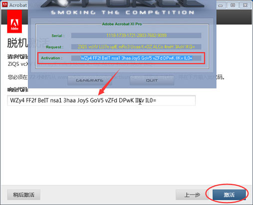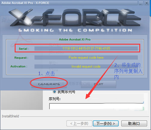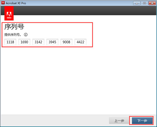 5、点击注册,并将生成的acrobat xi pro序列号复制入内,点击下一步