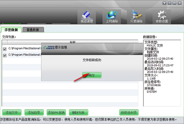 5、如图所示,现在已经粉碎成功了,你可以在软件界面添加涉密数据,也可以添加普通数据到软件粉碎;