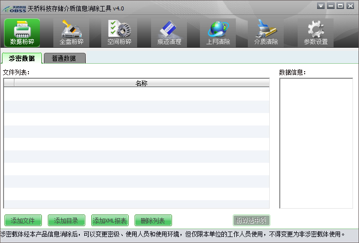 1、打开天桥科技存储介质信息消除工具,选择数据粉碎功能,将你的数据添加到软件;