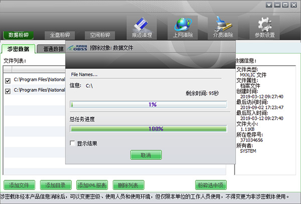 1、文件/文件夹销毁: 对单个、多个文件、文件夹等各种格式的数据进行销毁;