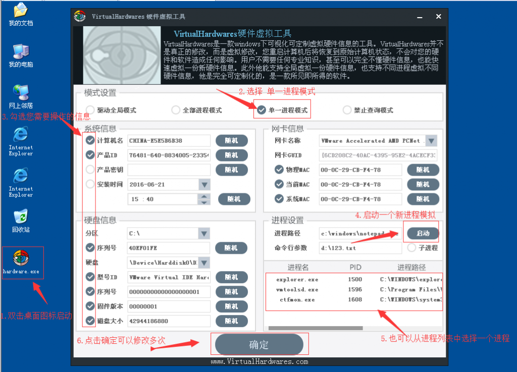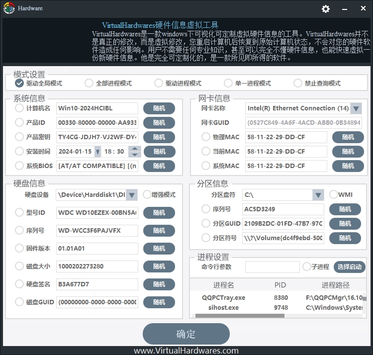 全部进程模式是对当前操作系统正在运行的所有进程进程虚拟一份完全一样的硬件信息,这个工具只是内部自动过滤了系统进程,不会对系统造成任何影响,并且此操作只会对系统正在运行的常用软件进行虚拟硬件。