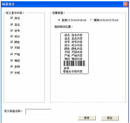 定义显示内容:可以随意选择标签内容显示,如店名,品名,货号,成分,颜色,尺码,产地,等级,条码,价格。