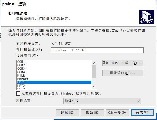 6、需要安装打印机的制造商和打印机,以及端口、打印机名称和语言;