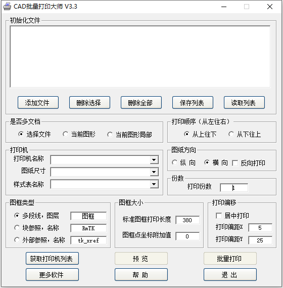 2、多文档批量打印,依次打开多个CAD图形文件,识别上述指定空间内的图框并打印。