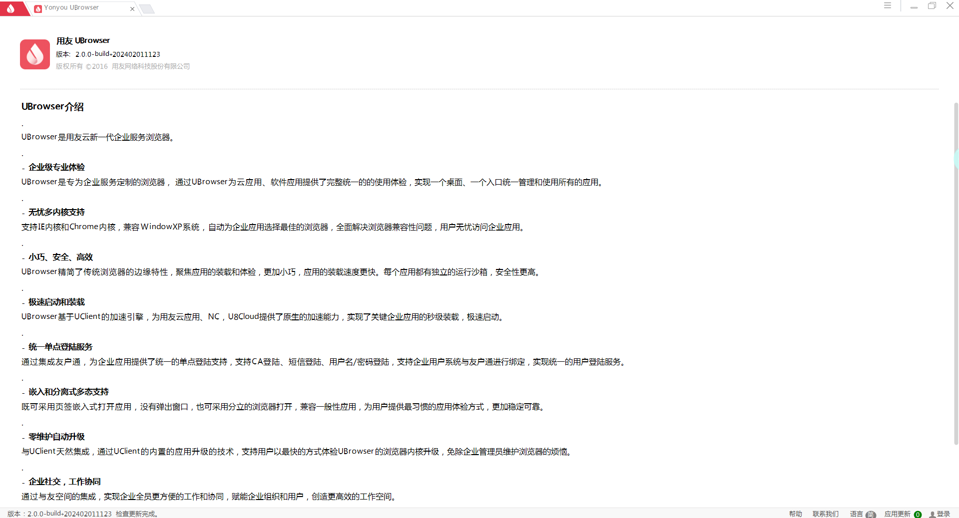 软件还与UClient集成,通过内置的应用升级技术,实现了快速浏览器内核更新,减轻了管理员维护浏览器的负担。它的特色功能包括企业级专业浏览器、云生态和应用商城、企业社交协同以及统一的企业服务入口。