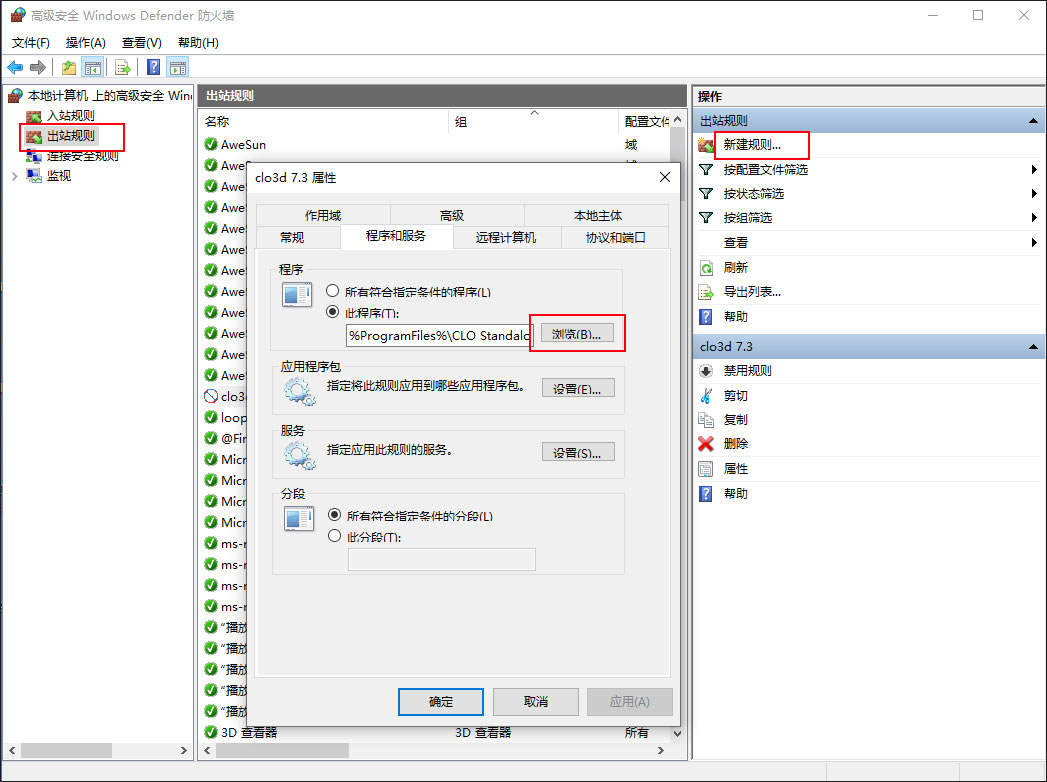 打开防火墙-设置出站规则--程序选择【C:\Program Files\CLO Standalone OnlineAuth\CLO_Standalone_OnlineAuth_x64.exe】