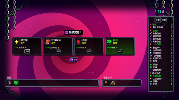6、玩家需通过消灭菜鸟获取经验升级,每次升级还可选取奖励,以此更好的战斗冒险。