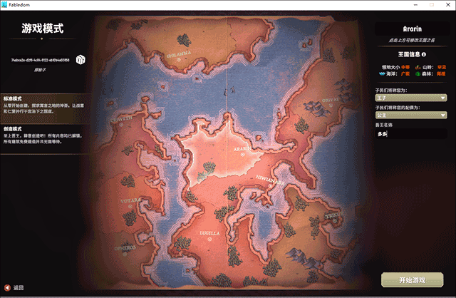 3、这里需要,玩家选择自己的国度位置和国王名字和基本特性后点击开始游戏选项;