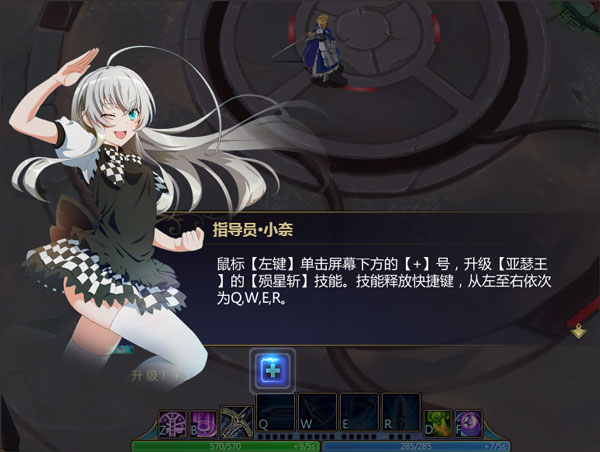 (2)鼠标[左键]单击屏幕下方的[+]号,升级[亚瑟王]的[殒星斩]技能。技能释放快捷键,从左至右依次为Q、W、E、R: