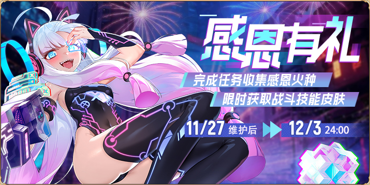 活动内容:完成节日任务,收集感恩火种,兑换多种游戏道具和左二少限时散修练气道袍;完成收集进度还可额外获取全新故障主题战斗技能皮肤