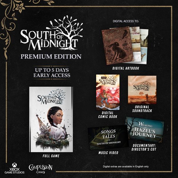 你可以在《午夜以南》这个光怪陆离的奇幻世界中,沉浸式享受尊享版带来的完整游戏、至多 5 天的抢先体验资格、和以下数字内容(仅限英文):