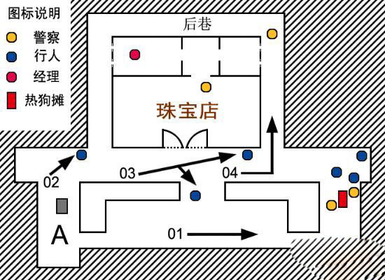 A点是出生点,红色方块是热狗摊(有时会出现,有时不出现),热狗摊的两个橘色的点是警察,周围会有3个行人,01的劫匪走到警察后面,尽量远离,然后戴面具,即刻用消音手枪射杀2名警察,然后F恐吓边上的4个行人,可以选择绑住,也可以E键击杀。在热狗摊没处理完毕之前,其他三名劫匪都不要冲入珠宝店,劫匪02控制一名行人(可杀可绑,一定用消音手枪),劫匪03控制周围的2名行人(可杀可绑,一定用消音手枪),劫匪04去后巷迅速击杀那里的警察,击杀完毕一定要去警察尸体上F键回复手台,此时如果珠宝店外围都清理完毕,那么劫匪01、02、03正门突入,一个负责击杀店里的警察(杀完不要忘了去尸体上F键回复手台),另两名速度恐吓店里的顾客,大概有7到8名顾客,如果之前绑绳没用的话,这里都用完,劫匪04从窗户突入,迅速控制经理室的所有人员,经理一定绑住,没有绑绳就击杀。所有人都控制完毕之后,一名劫匪在珠宝店巡视,不停的恐吓没有被绑住的顾客,另外三名开抢吧!直到所有包裹运送到接应的车那里,恐吓的劫匪速度回到撤退区域,如果协作的好,一声警报都不会响,大家轻轻松松洗劫店铺。