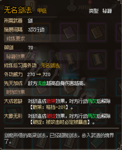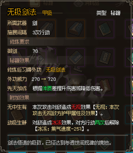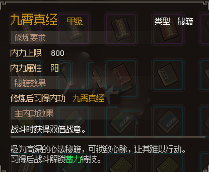 非常厉害的道玄宗镇派内功,橙色武学是4回合CD,紫色武学是3回合CD,有了这本内功之后加了新出产的忘忧丹,实现3个橙色武学轮流放不间断了。其它6个格子全部堆内功堆属性就行了。