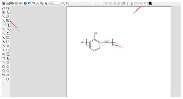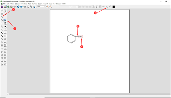 接下来需要将其余的化学基团一一添加上去,在图二所示的①处点击即可选择添加化学键,选中化学键后,如②所示,将化学键添加到苯环对应的键位,点击③处即可添加本,输入所要添加的化学基团即可,在这里大家要输入的是CH2,注意化学式的下标需要用⑤所示的图标来进行编辑。如果有字体大小不等的情况,可以在页面上方的字号处进行调整。