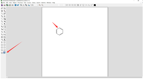 1、添加苯环首先,先在空白页面上添加苯环,在ChemDraw页面左侧的工具栏中单击鼠标左键,选中苯环图标,再点击页面空白处即可添加成功。