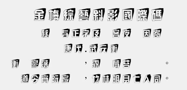 金梅综艺斜影国际码字体是一款非常常见的综艺字体,该字体端正大方,采用了斜影的方式增添了一种气势,具有强烈的视觉冲击力,整体看上去高端大气上档次,给人非常震撼的感觉,可以很好的应用于文本装潢、信息展示、网页设计、篆刻制模、数据制作、装潢设计、计算艺术设计、视觉设计、字帖等一切合法应用场景,有喜欢的朋友可免费下载收藏。